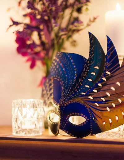 The theme was masquerade for this celebration. So we decided to use dark purples, reds and gold’s as our colour palette.
