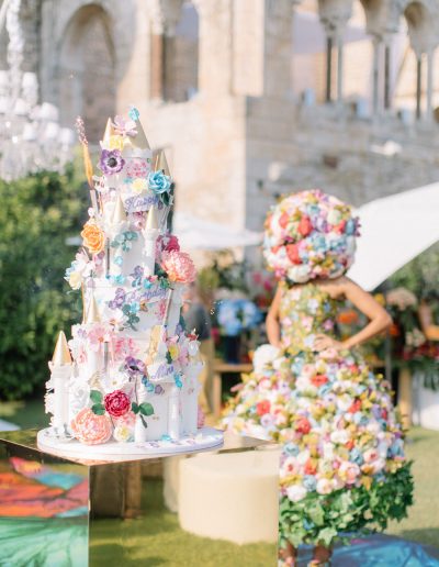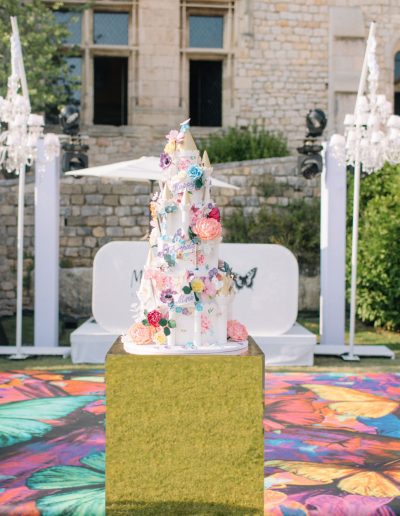 The Magic: We transformed the gardens of a beautiful French Chateau into a playground of colour and fun. Guests dined beneath a vibrant umbrella ceiling, a floral parachute decorated the bar, and a talented mixologist created the most exquisite drinks. The crowd was entertained by acrobats, dancers, live music, a bouncy castle, laser quest and a carousel!