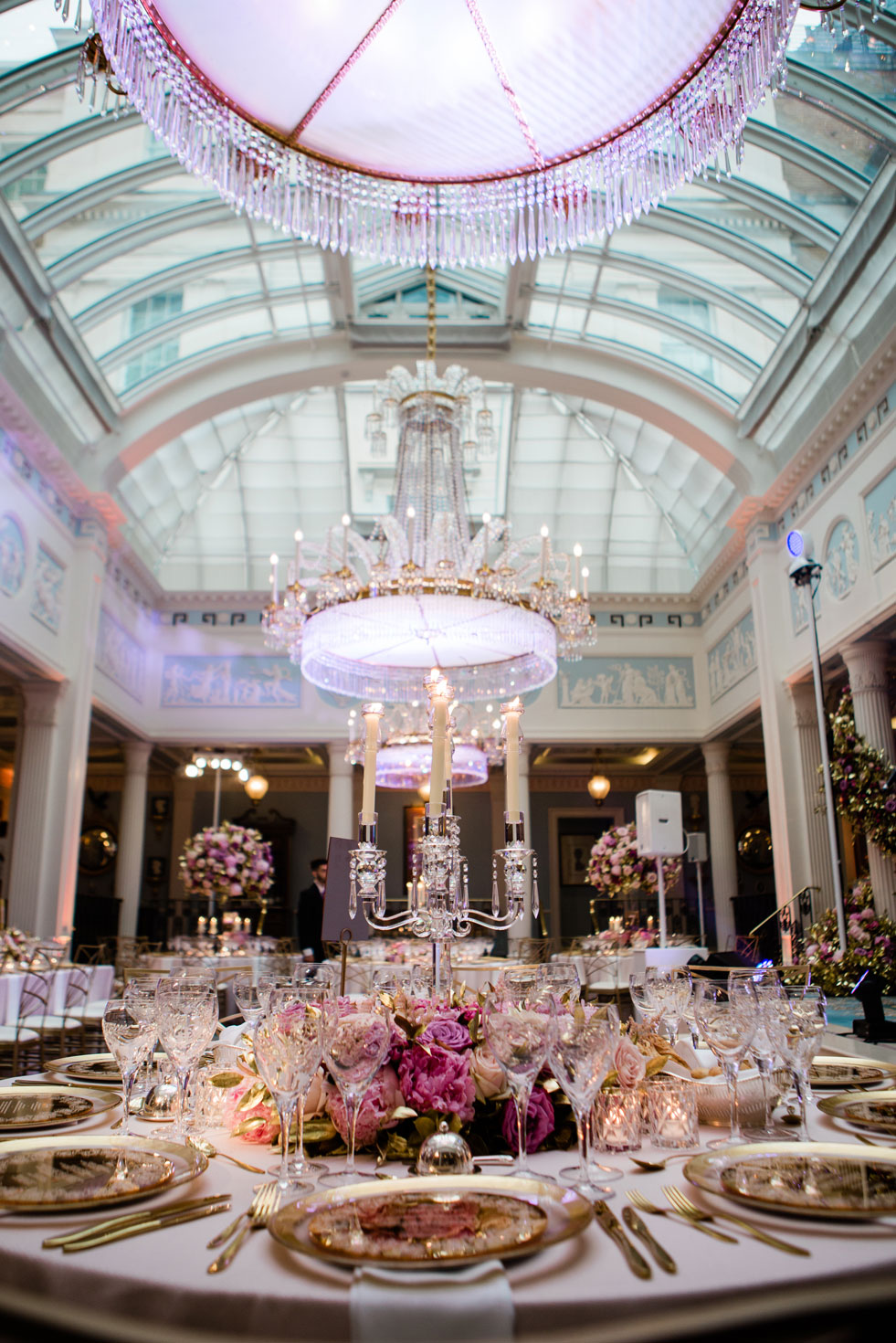 The Magic: The most glamorous chuppah, a theatrical and elaborate design of cascading rose garlands which twisted and tumbled down in a lavish flourish at Home House. Guests were transported to the wedding venue in a cream double decker bus. The Michelin started restaurant, Céleste at The Lanesborough, was hired exclusively for the wedding and filled with masses of gorgeous blooms in all shades of pink. Guests partied the night away on a gold mirrored dancefloor with a 10-piece band. They dined on the most fabulous three course meal which was printed on the most lavish gold mirrored menus. The dessert was custom made for the couple- strawberry milk chocolate fondant in a light pink shade. The couples wedding logo was then added on top, in an edible chocolate circle. Delicious!!
